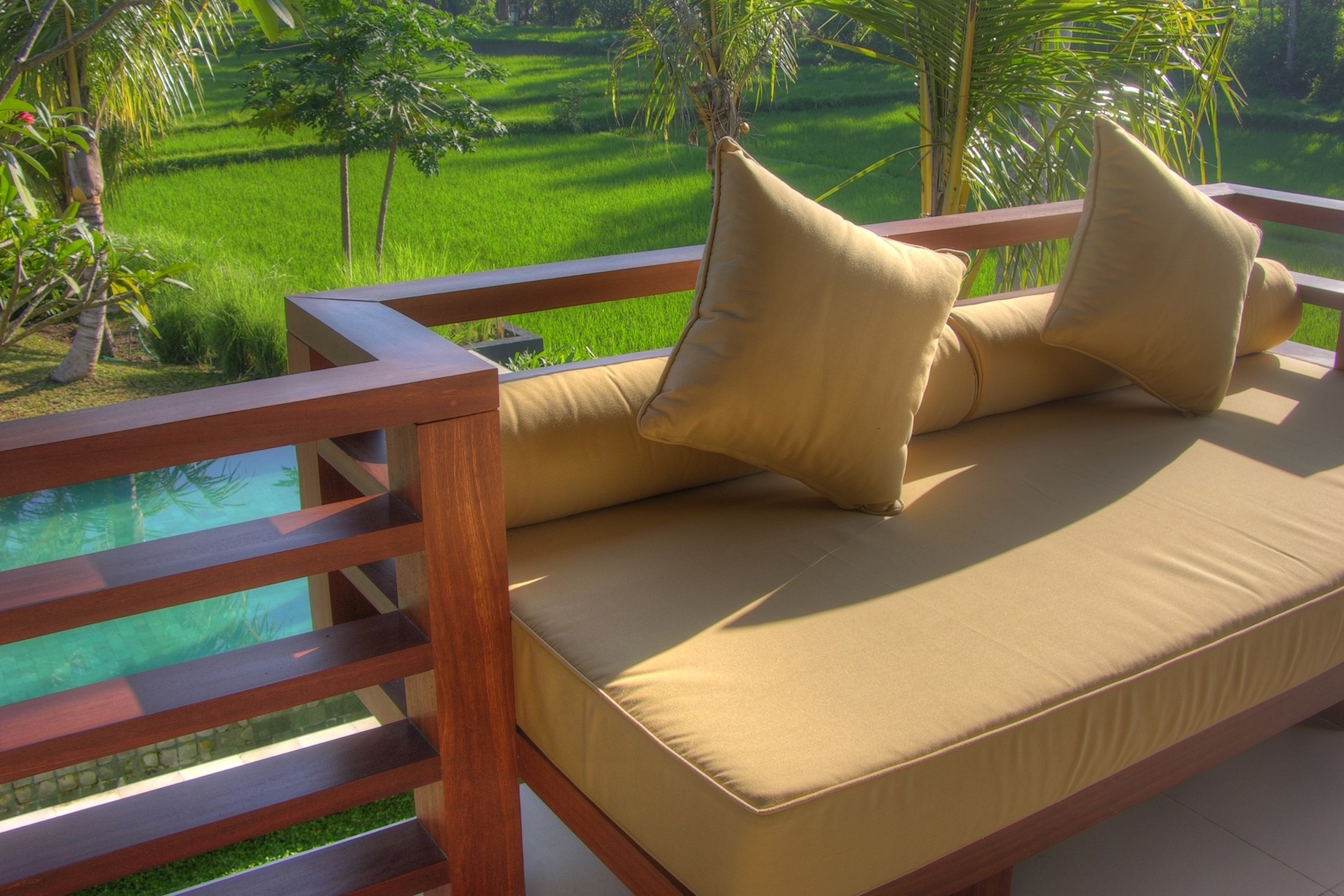 View of the Rice Fields, the small family temple of Peliatan Royalty, the Tropical Garden and Infinity Pool.